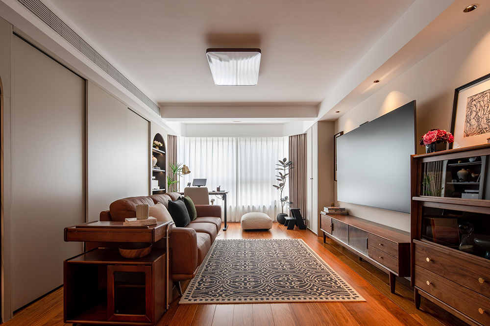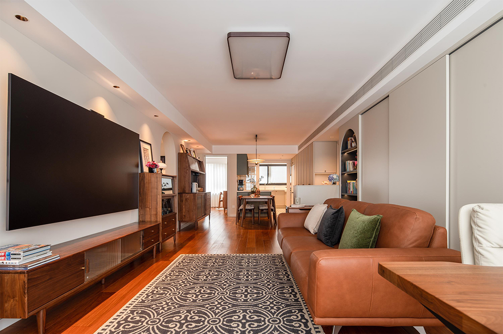 客厅国中古皮沙发、深木家具注入温润复古,无主灯设计、简约线条糅合现代松弛,弧形元素柔化边界,复古不厚重,简约有温度。