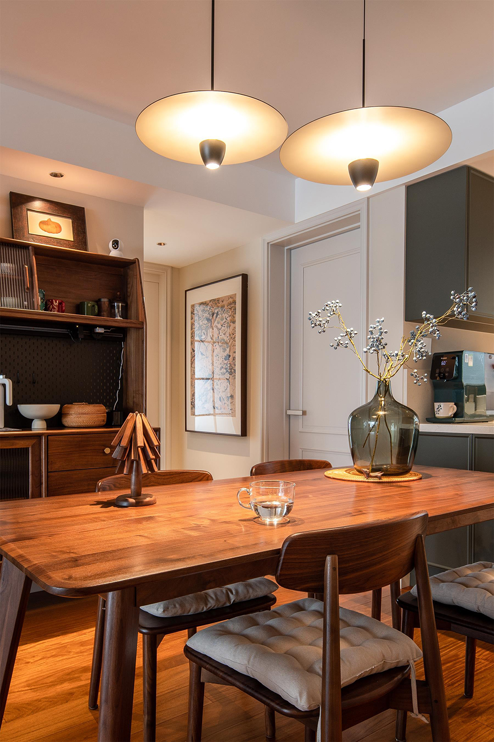 餐厅"用餐+收纳+展示"多功能的餐厅,餐边柜以开放格、洞洞板实现收纳与陈列,旁侧大型储物柜补足储物。