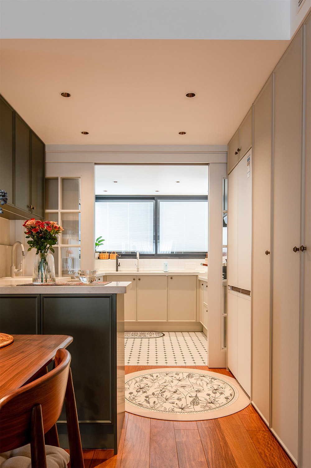 厨房U型操作台串联洗切炒动线,浅米地柜+深灰吊柜收纳充足;玻璃移门可开合,既实现餐厨互动,又能阻隔油烟,灵活适配场景
