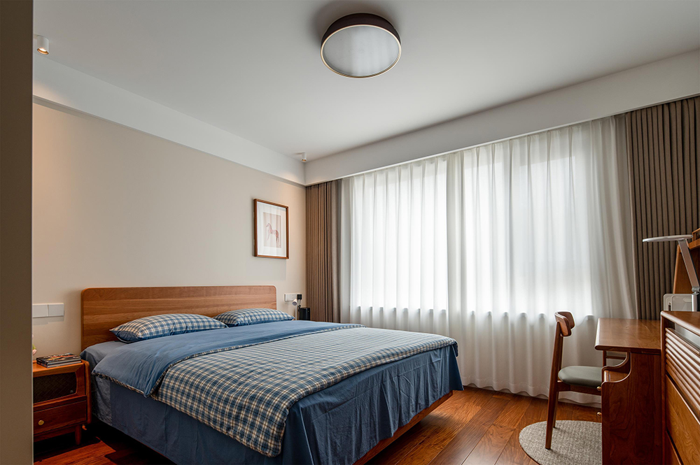 卧室睡眠区(木质床架+格纹床品)与学习区(樱桃木书桌+洞洞板收纳)并联,斗柜补足储物,双层窗帘平衡采光与隐私。