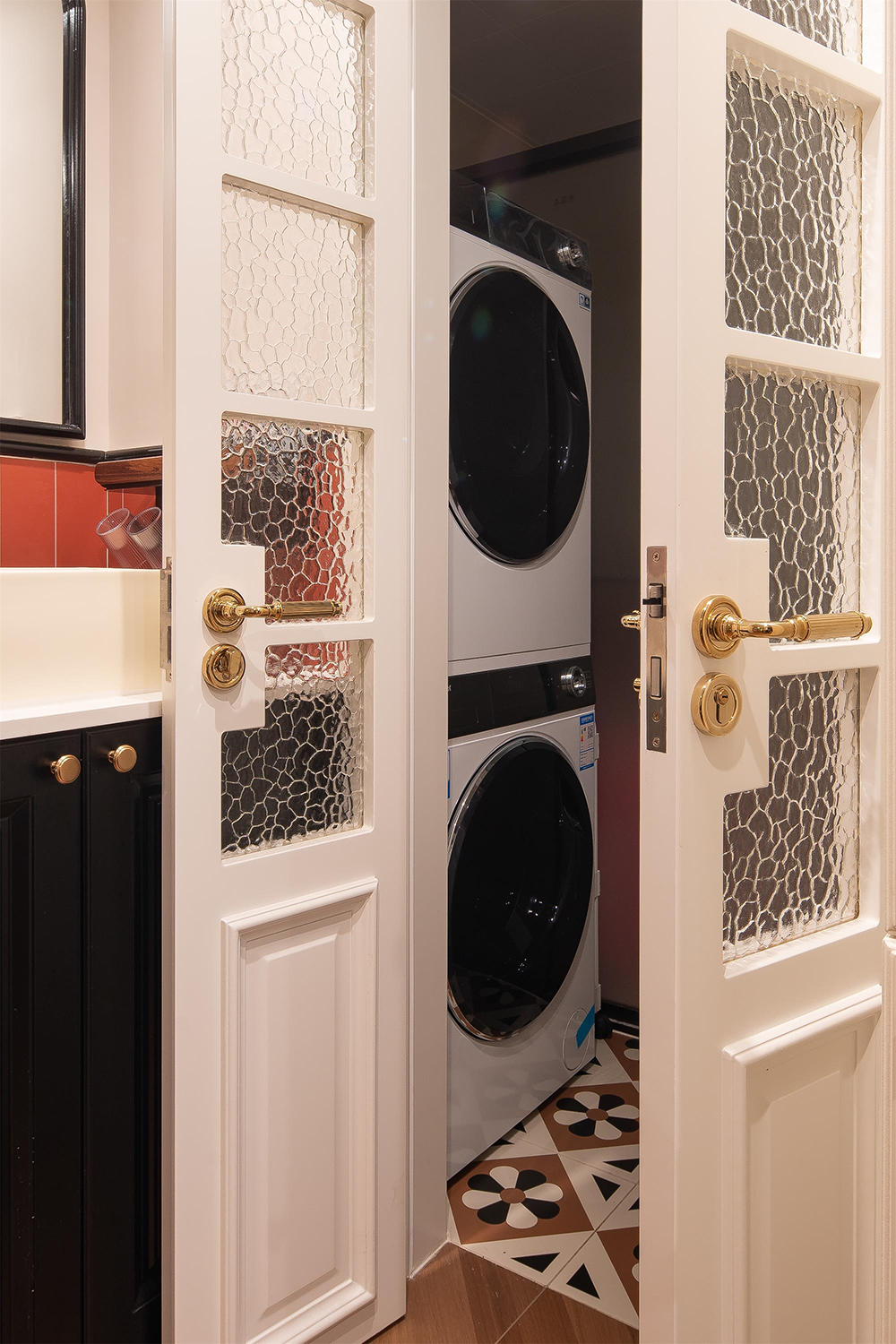 铜扣、琉璃把手点睛;弧形雕花镜、复古玻璃门(蜂窝纹+铜锁)复刻法式符号。湿区藏于门后,花砖地面呼应复古