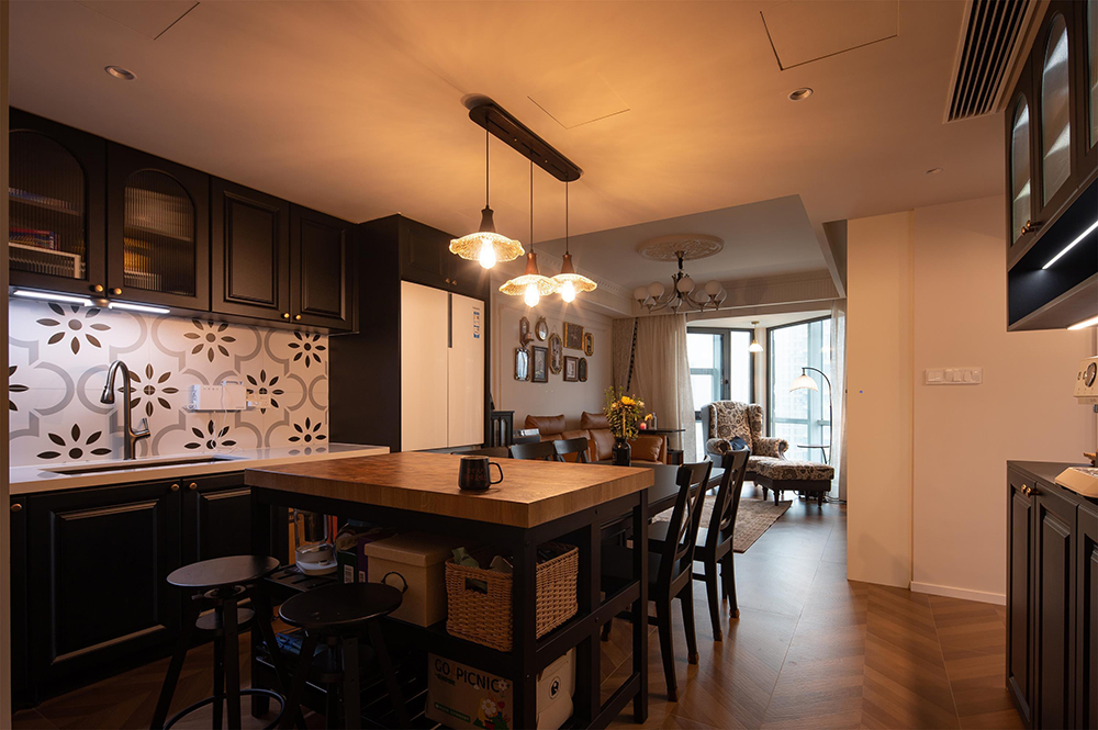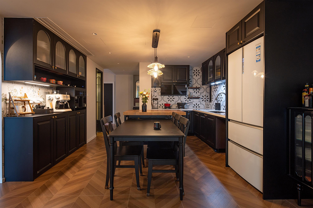 客餐厨贯通,鱼骨拼地板串联动线,中岛衔接餐桌,打破功能边界。深黑橱柜嵌铜拉手、波纹玻璃,复古精致
