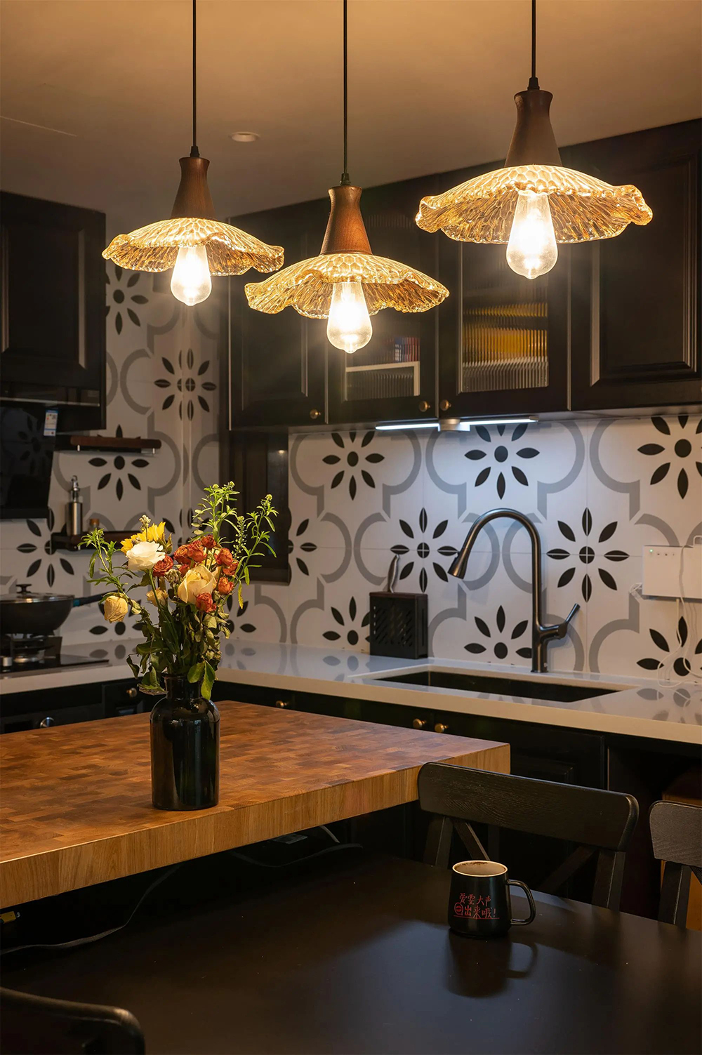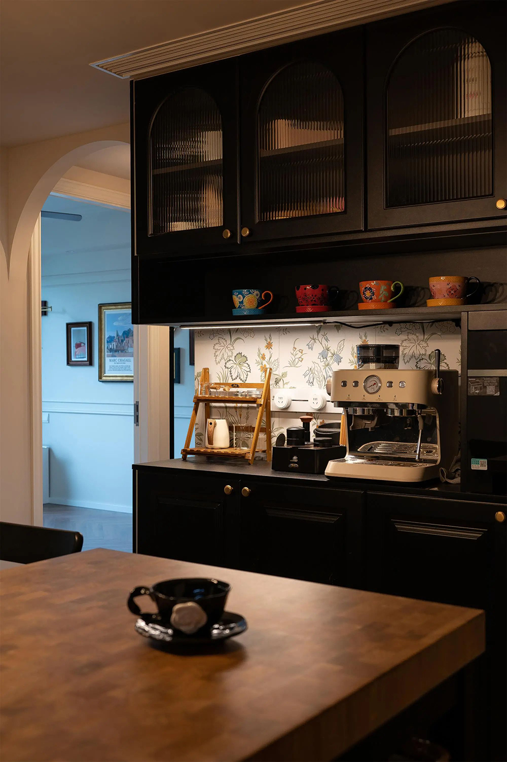 木色中岛、藤编吊灯注入温润,复古咖啡机、彩釉杯陈列,暖光漫溢,让烟火日常与法式优雅共融