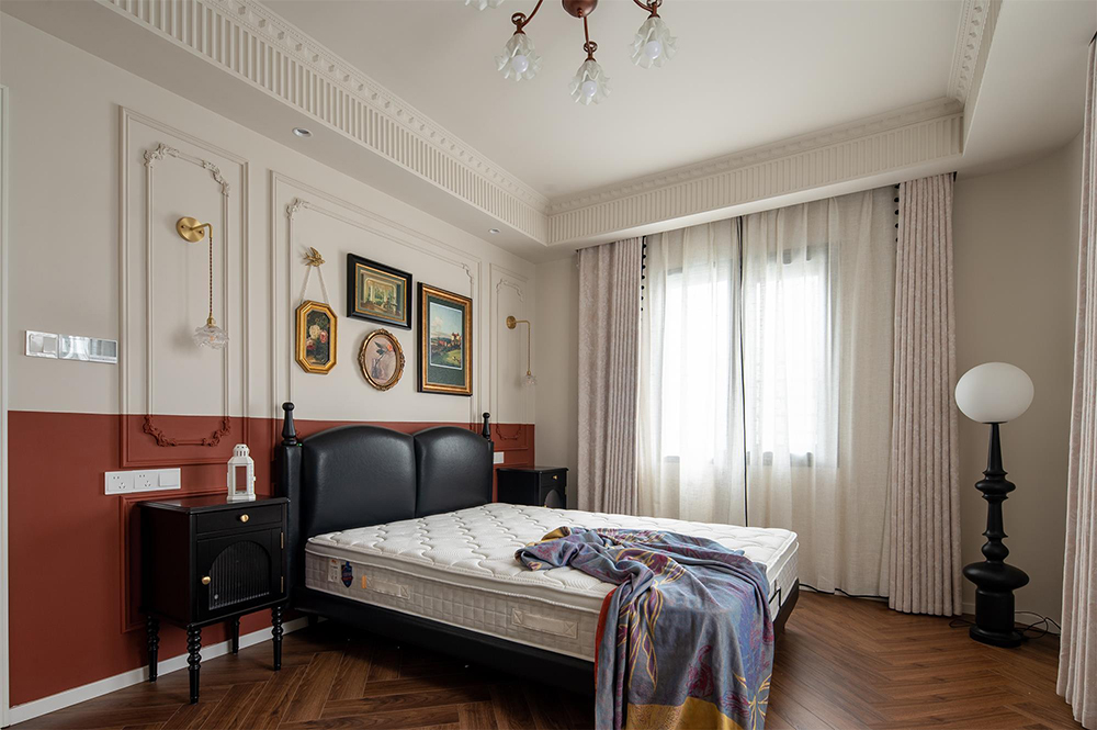 黑色皮质床头、铜扣床头柜显硬朗复古,黄铜壁灯与错落画框点亮细节。嵌入式书桌区黑白柜体整合收纳,鱼骨拼地板添温润。
